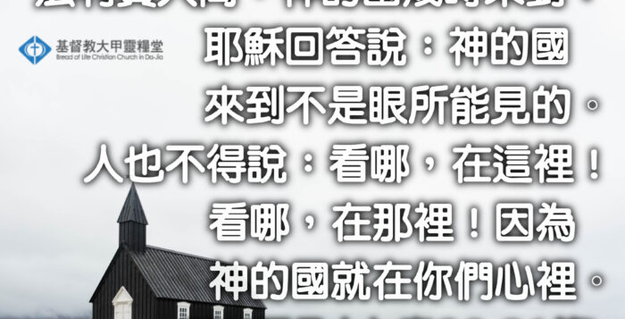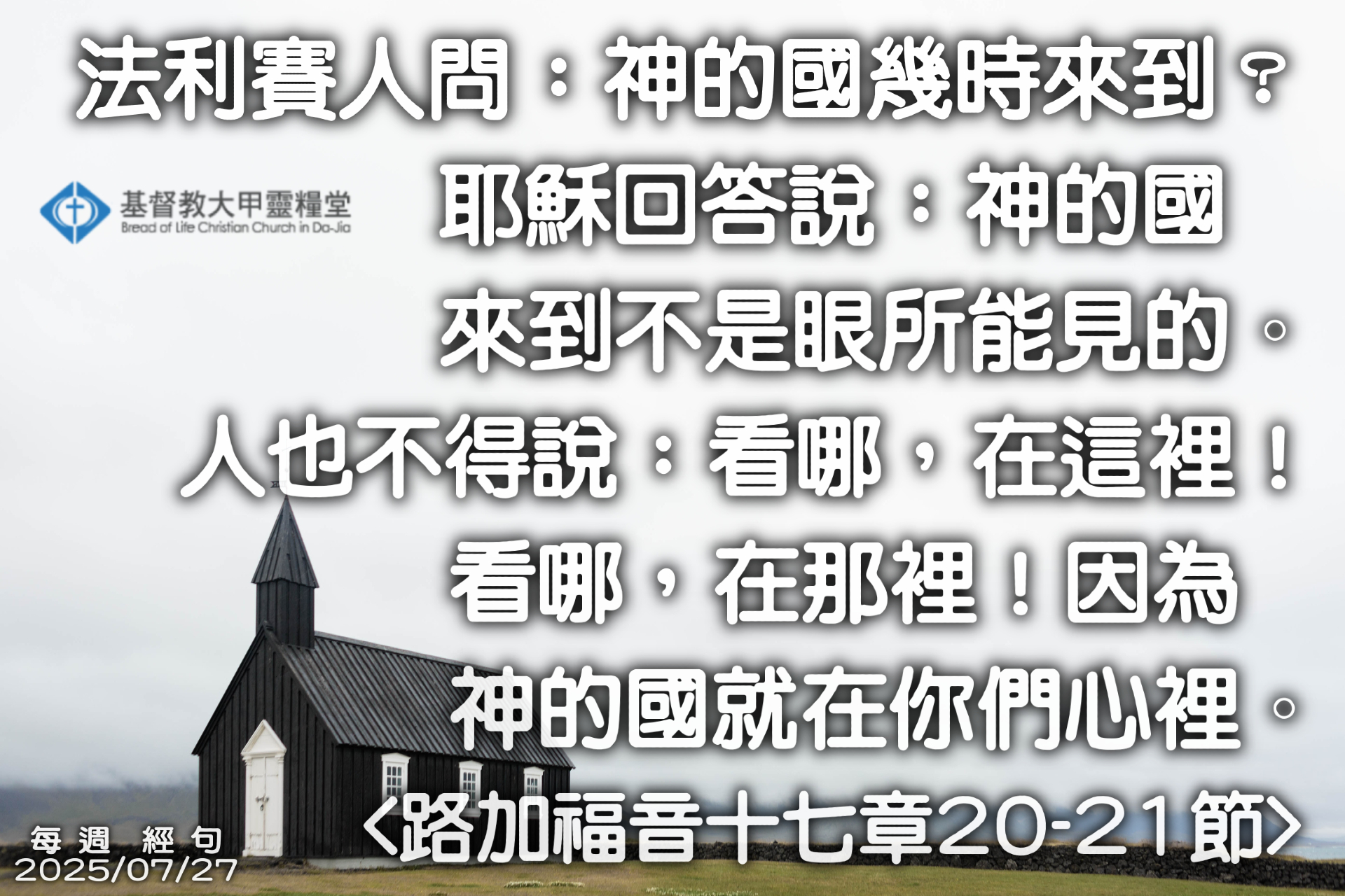 每週經句圖下載 – 20250727 每週經句 2025-08-04 132 法利賽人問:神的國幾時來到?耶穌回答說:神的國來到不是眼所能見的。人也不得說:看哪,在這裡!看哪,在那裡!因為神的國就在你們心裡。 <路加福音十七章20-21節> 按此下載: 解析度 1920×1280