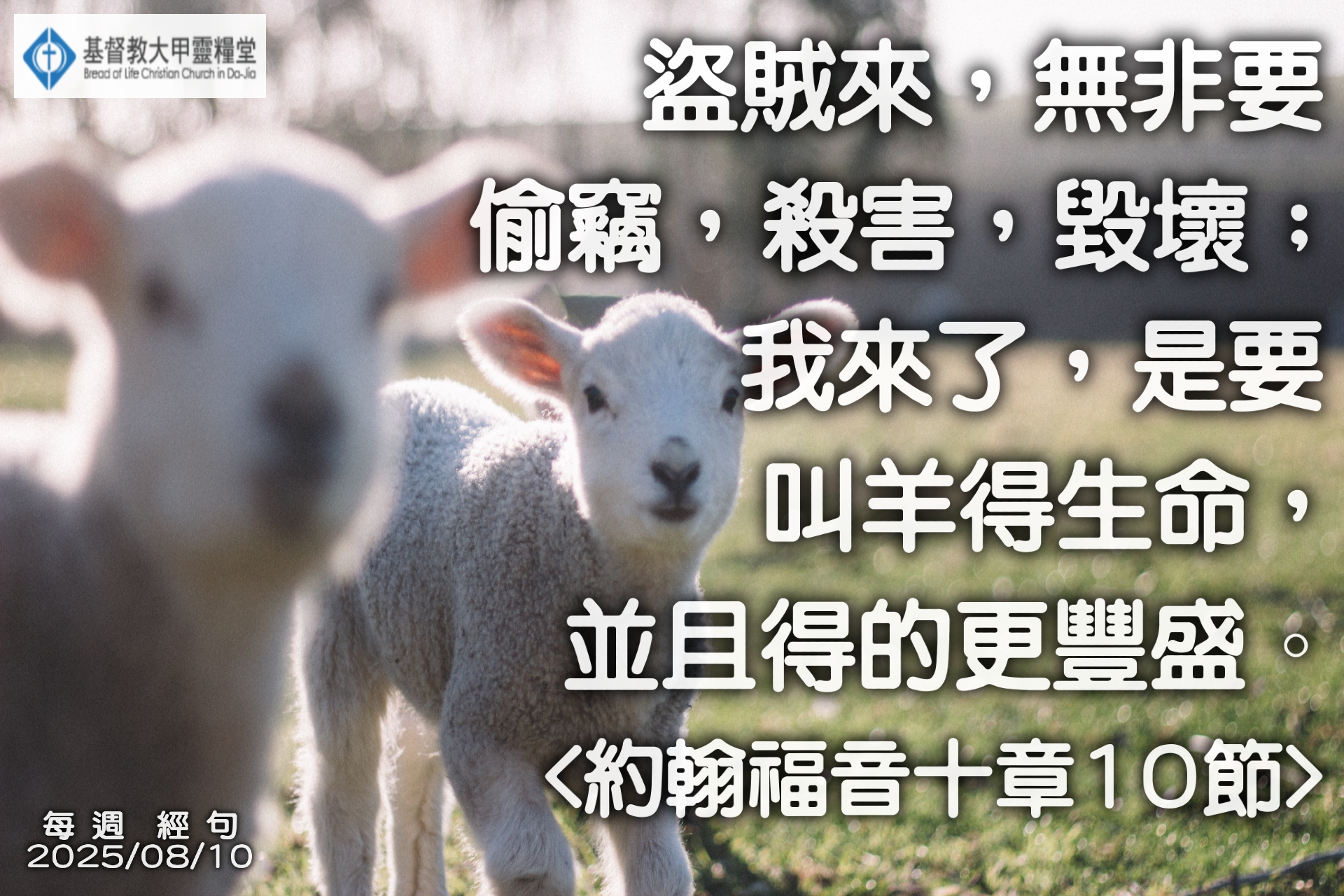 每週經句圖下載 – 20250810 每週經句 2025-08-13 140 盜賊來,無非要偷竊,殺害,毀壞;我來了,是要叫羊得生命,並且得的更豐盛。 <約翰福音十章10節> 按此下載: 解析度 1920×1280