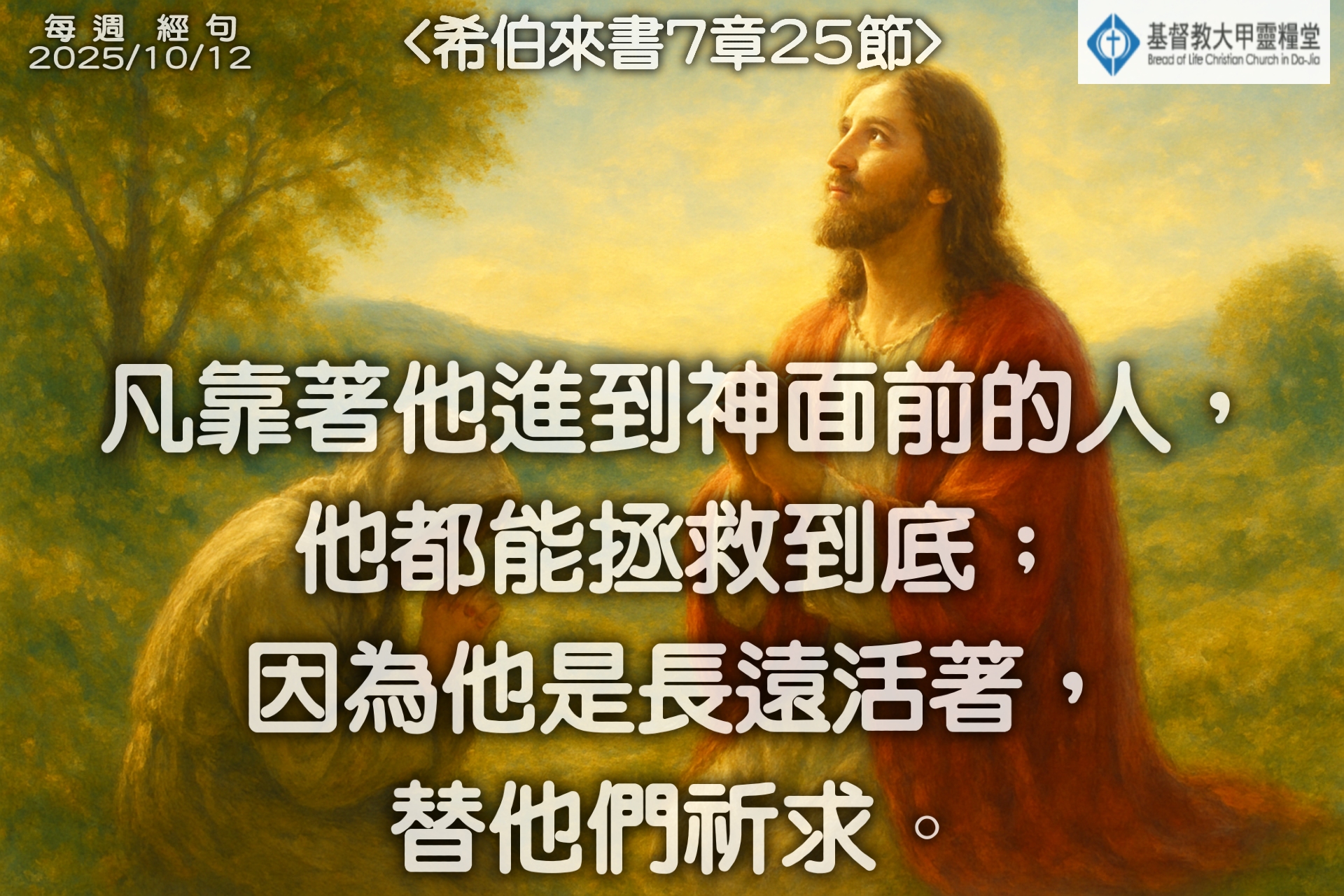 每週經句圖下載 – 20251012 每週經句 2025-10-16 38 凡靠著他進到神面前的人,他都能拯救到底;因為他是長遠活著,替他們祈求。 <希伯來書7章25節> 按此下載: 解析度 1920×1280