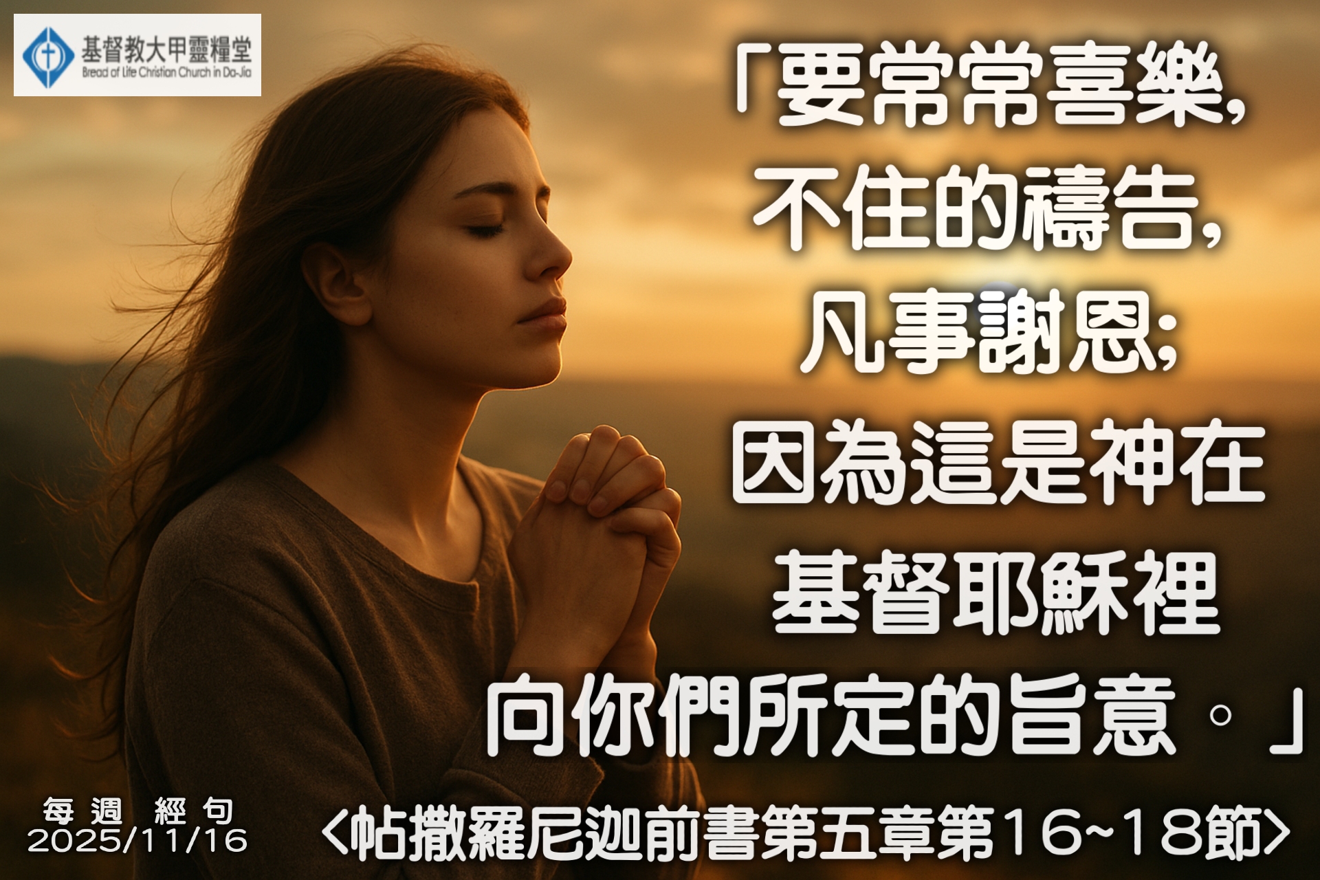 每週經句圖下載 – 20251116 每週經句 2025-11-18 156 「要常常喜樂,不住的禱告,凡事謝恩;因為這是神在基督耶穌裡向你們所定的旨意。」。 <帖撒羅尼迦前書第五章第16~18節> 按此下載: 解析度 1920×1280