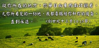羅得離別亞伯蘭以後,耶和華對亞伯蘭說:「從你所在的地方,你舉目向東西南北觀看;凡你所看見的一切地,我都要賜給你和你的後裔,直到永遠。 <-創世紀十三章14-15節> 按此下載: 解析度 1920x1280